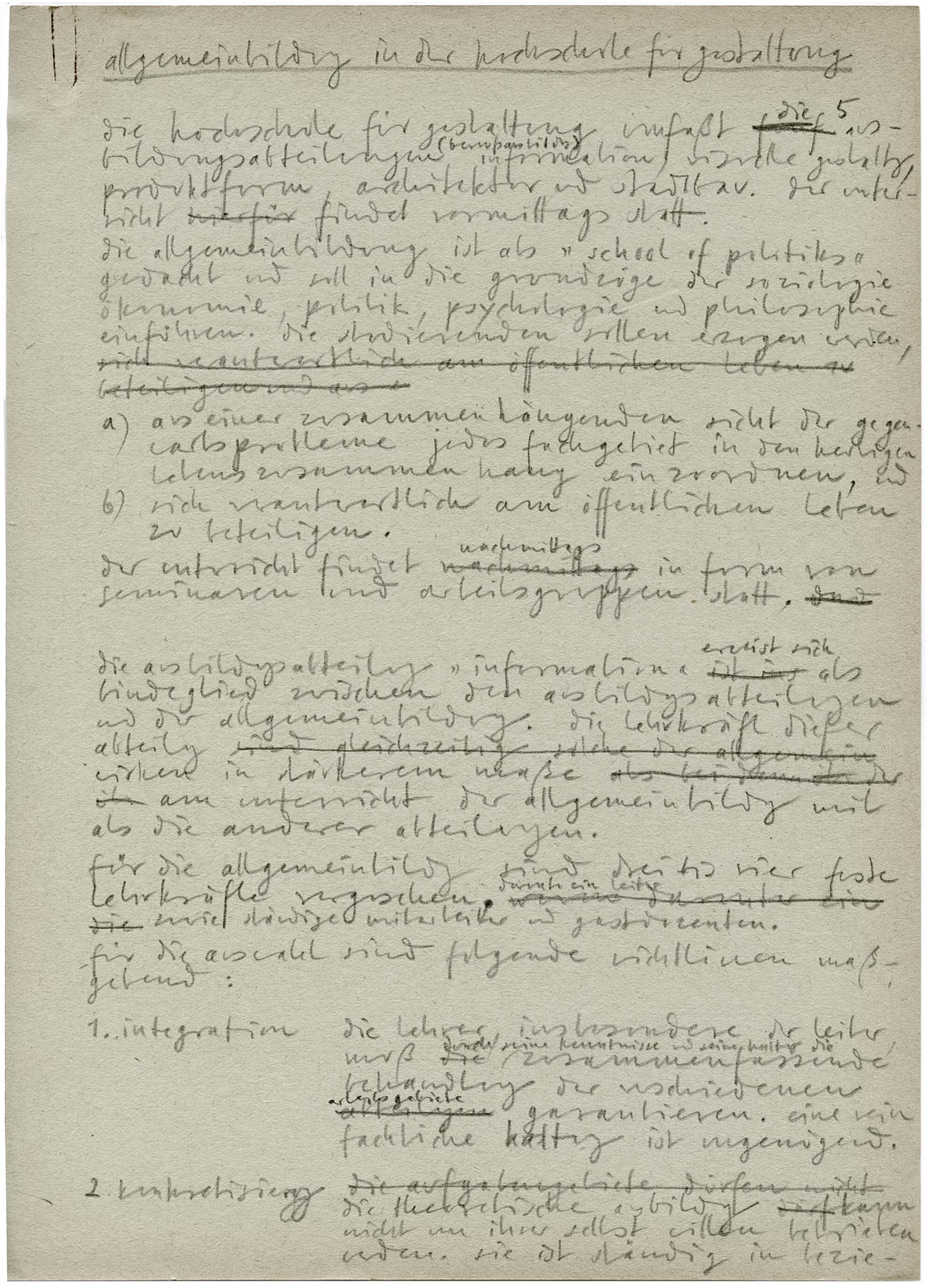 die lehrer, insbesondere der leiter, muß durch seine kenntnisse und seine haltung die zusammenfassende betrachtung der verschiedenen arbeitsgebiete garantieren. eine rein fachliche haltung ist ungenügend.