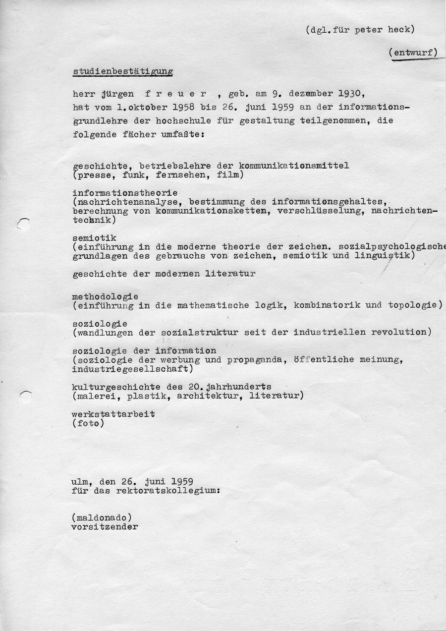 Im Zuge der Recherchen für ihren ersten Artikel über die Abteilung Information sprach Christiane Wachsmann im Juni 1991 mit Jürgen Freuer. Sie machte von diesem Telefongespräch eine ausführliche Notiz, ohne dabei an eine Veröffentlichung zu denken: Es ging mehr darum, Material zusammenzutragen. Inzwischen ist Jürgen Freuer verstorben, ein weiterer Austausch fand nicht statt. In diesem provisorischen Text entsteht immerhin ein Eindruck von Freuer und seinem HfG-Studium. Deshalb haben wir uns entschlossen, ihn hier unverändert abzudrucken.